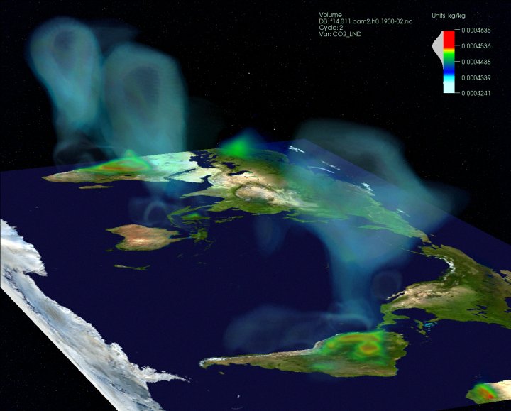 The CO2 tracer originating from the land surface is shown as a colored cloud above the continents. This tracer is the product of the net ecosystem exchange (NEE) between the biosphere and the atmosphere, and it is advected in the atmosphere by the Community Climate System Model Verison 3 (CCSM3). Click to view larger image. Produced by Jamison Daniel for the SciDAC Review.