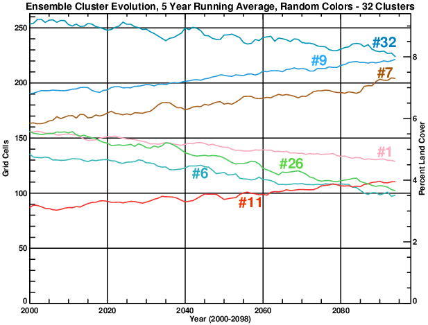 Ensemble Cluster Evolution, 5 Year Running Average, Random Colors - 32 Clusters